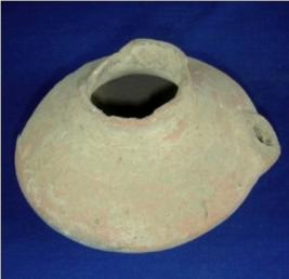 | Description / विवरण | Coarse, ill fired terracotta spouted pot with circular flat base, flayed body with a broken spout, narrow neck and slightly raised rim which is partially broken. A large hole due to breakage is visible just opposite to the spout. The body is highly coordinated. |
