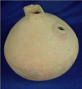 | Description / विवरण | Fine, spouted terracotta pitcher with flat circular base, bulbous body with a broken spout at the upper part and narrow neck which is partly broken. Striation mark is seen around the spout. |