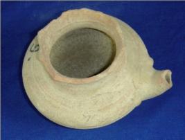 | Description / विवरण | Terracotta spouted pot of circular, flat base, broad flared body with a spout, high neck and broken rim. There are incised circles around the body. The pot has clay incrustation all over. |