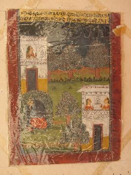 | Description / विवरण | In this painting Krishna is shown in sitting posture below a cripple, and three female are also shown at the balcony of building. It has a text in Awadhi languages |