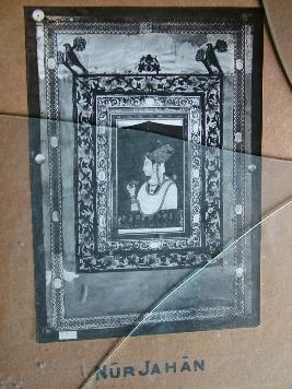| Description / विवरण | This is a photograph of painting Nurjahan which has been shown from lateral side within few rectangular shaped, geometrically and floral design boundary. She is having a scarf Veil , necklace, crown, and bangle. Also she is holding a miscellaneous object with right hand. Moreover she is wearing ear rings. Just below the lower portion of her floral designs can be seen. It is mounted in wooden frame. |