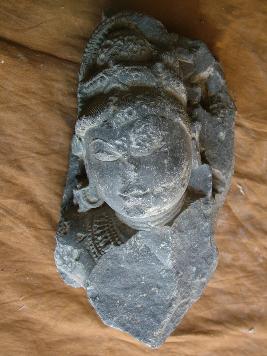 | Description / विवरण | It is a bust of a female. It has a beautiful ornate crown, long ear ring. It is chipped off below its neck. |