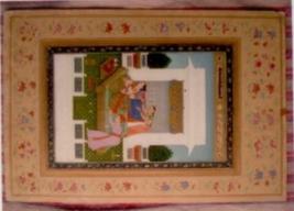 | Description / विवरण | The painting depicts Ragini Ram kali with a woman lying on a green bed wearing a golden skirt looking side wards and a man in front touching her feet. A woman is approaching to hold her. The terrace floor is green with wavy patterns in gold, A building structure behind them and trees and blue sky in the Background. |