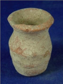| Description / विवरण | Terracotta Miniature Pot of round cylindrical shape with round flat base, narrow neck and broad mouth with thick averted rim. Body is carinated in middle. |
