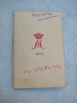 | Description / विवरण | This is greeting card which is having four cards joined, English capital letter M and 1914 have been painted. On the two others card which are inside few words of roman scripts and English language along with a leaf and fruits have been printed. |