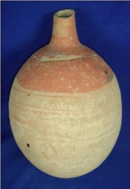 | Description / विवरण | Terracotta tumbler of oval shape and high neck but rim is missing. The upper part has per fired Gupta red pottery effect. The lower portion has earthly incrustation and the above portion has deep crack around the neck. There is a perforated hole in the lower portion of neck. |