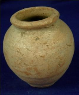 | Description / विवरण | Terracotta Miniature Pot of round circular shape. The upper part is round tapering towards bottom. The base is circular and flat with a hole due to breakage. It has a thick averted rim on low neck. The jar has glazed surface. |