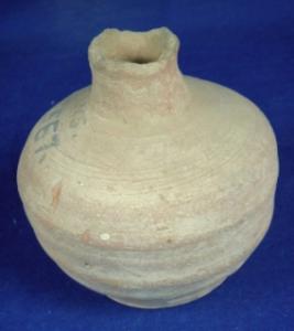| Description / विवरण | Plain, terracotta coarse vessel - a vase with narrow, high neck, bulbous body and broad, flat, circular base. It has double mild carination at the waist. The rim is broken. |