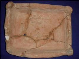 | Description / विवरण | Thick, rectangular terracotta votive tank, with four circular joints at each corner. The inner side is shallow having two embossed leaf designs. It is broken into seven pieces, but restored. It is from Kushana period. |