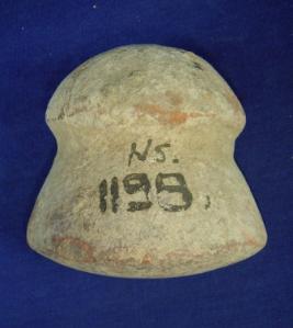 | Description / विवरण | Terracotta potter s mallet, having double bridged body, used by the potters for tapping the surface of the pot or jar on their removal from the wheel. The lower portion is called dabber. The upper portion is broken. |