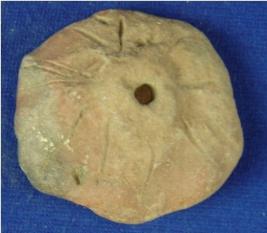 | Description / विवरण | Crudely made, flat and perforated terracotta wheel. One side has prominent thumb impressions while other side has designs of radiating incised lines. The surface near the center is raised outwards on one side. |