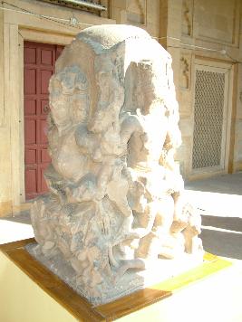 | Description / विवरण | It is carved with Brahma, Vishnu Maheswar Shiva and Surya on 4 sides. All are in seating posture. Brahma has 3 faces and 4 arms with two devotees. Vishnu is shown with Garuda in human form, with devotees. Shiva 4 hands with Nandi. Surya with 7 horses . All have prabhamandalas. The top part is domical in shape. |