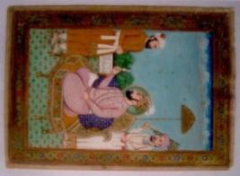 | Description / विवरण | Mughal emperor is sitting on the golden throne wearing a pink cloth a golden turban on his head a green halo behind him. He is holding a flower in his right hand. Two assistants are standing in opposite side of each other. Background is painted with white cloud green blue and arched. |