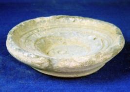 | Description / विवरण | Terracotta lid with inverted rim, shallow depression having spiral design on the exterior, flared body and carinated base with string marks. |