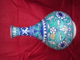 | Description / विवरण | This object has pedestal base, almost vertical sided belly. Its neck is narrow white its mouth is wide. The entire pottery is decorated with raised floral designs in golden over the green and red base colour in Bidri ware . |