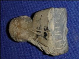 | Description / विवरण | Terracotta seals having incised Brahmi script at the bottom. A bulbous holder is seen at the top. |