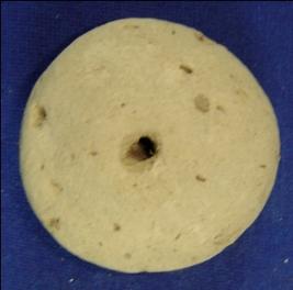 | Description / विवरण | Terracotta wheel, broad rim perforated hole in the center, most probably to fix the axle of toy cart, surfaces on both sides are plain, the perforation is blocked with clay, center is raised outward. |