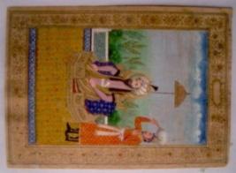 | Description / विवरण | The painting depicts a Mughal Badshah seated on a hexagonal golden chair with a pillow behind, wearing a golden jacket and a green halo with one attendant standing behind. The foreground is yellow with geometric patterned designs and background has greenery, flowers and blue sky. Well-decorated border. |