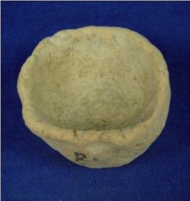 | Description / विवरण | Coarse terracotta vessel - bowl with featureless rim, cylindrical body and flat base. It is hand made and crudely finished, with prominent finger marks. |