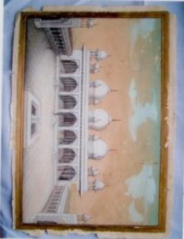 | Description / विवरण | This is a Moti Mosque with three dome and fifteen minarets, seven rose arched front side of it. A fountain in middle ground colour used in Moti mosque white and grayish sky blue in background many people are moving outside of door and inside. |