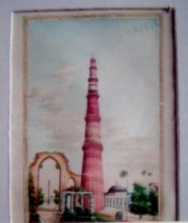 | Description / विवरण | In this painting Qutab minar has been shown in red color having five stories. Upper storey is painted with white color, in its background arched entrance with Mehrauli iron pillar. People has been shown rains of other structures and trees can also be seen. Persian script is written below the painting. |