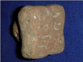 | Description / विवरण | Terracotta seal having alphabets of Brahmi script. The seal has a square base with a round knob having a hole on each side. The face of the seal is slightly rubbed off and sides are curved inwards. |