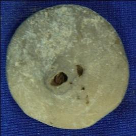 | Description / विवरण | Perforated terracotta wheel, handmade ill fired betel nut in shape probably used in toy-cart. |