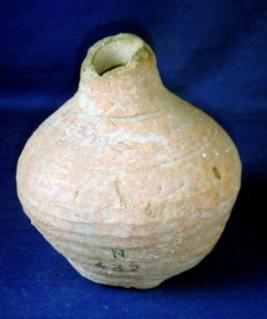 | Description / विवरण | Terracotta vessel- Pot, ill fired, with flat circular base, bulbous body with sparse striation marks, the mouth and rim is broken. |