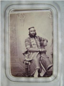 | Description / विवरण | In this photograph a person is sitting on a chair. He is well dressed in kurta and payjama and shoes. He has a thick beard and wearing a cap with borders |