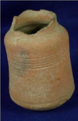 | Description / विवरण | Terracotta Jar, cylindrical in shape with round body slightly curved inward, and narrow neck which is partially broken. The rim is missing. It has flat base and the upper part of the body has close striation marks. |