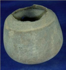 | Description / विवरण | Terracotta jar with oval base and cylindrical body. The upper part from container is broken. A small hole is seen on its body and body is carinated on upper part. |