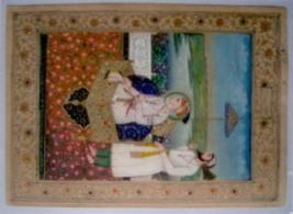 | Description / विवरण | The painting depicts an aging Mughal Badshah seated on a golden chair with pillow holding a knife in his hand wearing a white Jama Tunic and a halo behind with one attendant standing behind. The foreground is in red floor with floral and wavy patterns and flowers, a river, green field and blue sky in the background Well decorated border. |