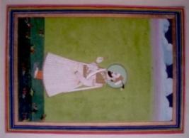 | Description / विवरण | The painting depicts Sultan Abu Saeed Badshah standing, wearing a long white jama with gold decorations and a halo holding a flower like thing in his hand. The foreground is dark green with flowers. Middle ground is light green with blue sky with clouds in the background. |