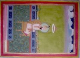 | Description / विवरण | The panting depicts Badshah Jalaluddin seated on a golden chair with an umbrella wearing a white and gold jama and a halo with one hand resting on another. The foreground is a terrace floor in green with floral decorations and wavy patterns The background has green field with high horizon with clouds. |
