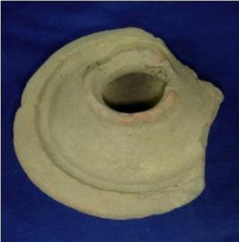 | Description / विवरण | Half broken terracotta container, having round body, flattened neck, thick rim, broken mouth and a narrow flat base. The body is highly carinated and broken. |
