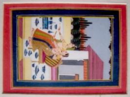 | Description / विवरण | The Painting depicts two women seated on a cushioned chair with their right hands forward holding something in gold. There are blue coloured pots kept all around. At the background there is a hut, vegetation behind and blue sky. |