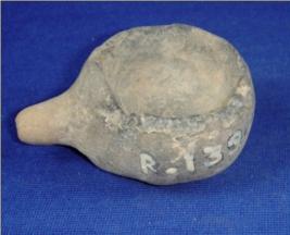 | Description / विवरण | Hand made coarse miniature container with spouted tip, which is broken, circular base, bulbous body and a open mouth with featureless rim. A perforated hole is seen inside it, probably used to pour water or oil. |