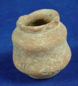 | Description / विवरण | Coarse terracotta double lota, flat and round base, wide mouth and rim portion broken. Clay incrustation all over. |