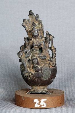 | Description / विवरण | Manasa, the goddess of snakes in the Brahamanical pantheon. She is seated under a snake hood. She is surrounded by snakes. There is an inscription on the pedestal. The next image is the backside of the composition which is in the shape of a pot. |