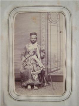 | Description / विवरण | In this photograph a person is sitting on a chair, carrying a stick in his left-hand, a child is sitting on his lap. He right hand is on his lap. Both are well dressed. |