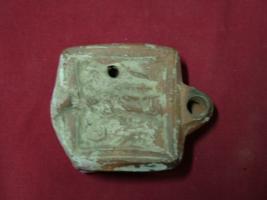 | Description / विवरण | A lamp with a rectangular oil-chamber and round nozzle with traces of burning . The centre has a male figure with a draped tunic. The handle is missing . There is gypsum on the base. |