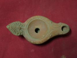 | Description / विवरण | Lamp with circular oil-chamber and it has a very oblong nozzle. The handle has palmelte motif. |