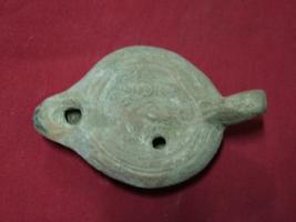 | Description / विवरण | The circular lamp, has a circular oil-chamber and short nozzle. The handle is small and unpierced . On the top is protrayed Demeter with a pipe; the curly head of the goddess is surmounted by a crecent and a disc. |