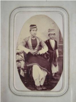 | Description / विवरण | In this photograph a young man is sitting on chair and a small boy is standing besides him. Both are wearing long coats and cap with broad border. |