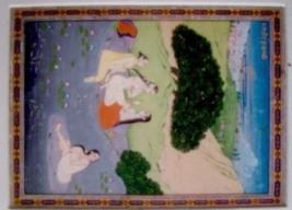 | Description / विवरण | The painting depicts four women in bathing scene. One nude woman is seated on a raised ground in the middle of a gray coloured with lily flowers. Other three semi nude women are seated in riverbank. At the background there is a wavy landscape with a big tree, a font and blue sky. |