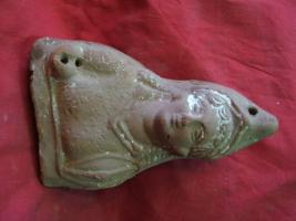 | Description / विवरण | The goddess--Athena, wears a helmet and an umbonated oblong shield. Her curly hair hanging on her shoulder. The goddess wears a chiton. The nozzle projecting from the right side. The back is slightly convex with a circular opening. |