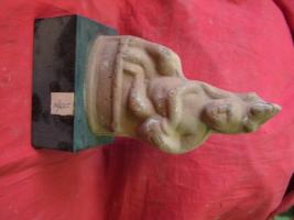 | Description / विवरण | The god is shown half inclined on an oval base. He is holding a vessel with one hand placed in it and other around it. Head little titled on the side. The back is slightly convex with a circular opening. He is represented naked with a long phallus and shaven head with pshent flanked by two lotus buds.. Two lo |