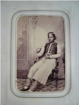 | Description / विवरण | In this photograph a person is sitting on a chair holding a stick in his left hand. He is well dressed and is also wearing a cap. |