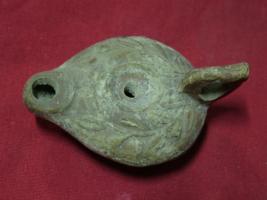 | Description / विवरण | A lamp with a circular oil chamber and small round nozzle. Small upwardly projected handle with a hole. It hasa very large shoulder on which is outlined in relief a myth-wreath. It has a high stub pierced handle. |