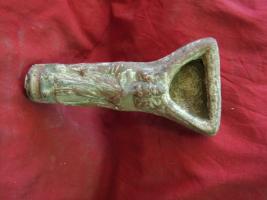 | Description / विवरण | Harpocrates. The god standing on a oval shaped base is depicted on torch holder. The god wears a draped tunic and his left finger raised to his lips. There is a large triangular opening on the head of the god. |